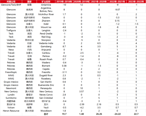 供应端,2022年南美洲和澳洲因罢工、洪水、品位降低等原因锌矿产量大幅下降,国内因品位下滑和炸药受限等影响,产量下滑,增产预期后移。考虑到前期新投项目将继续爬产、2022年意外减产项目的恢复、以及停产较久的小型矿山复产,预计2023年海外矿端产能同比增加2.8%或22.7万吨左右增量,国内锌矿产量同比增加8万吨左右,全球合计约30万吨左右的新增产量。同时,考虑到矿山服务年限、矿石品位、地缘等因素,远期锌矿产出兑现效果仍存在继续打折的可能,预计矿端供应呈现缓慢增长的态势。