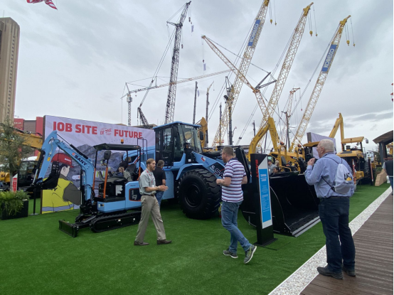 三一重工在展会展出了电动装载机和迷你电动挖掘机。不过,这两款产品并非针对美国市场设计,电动装载机是出口智利的机型。