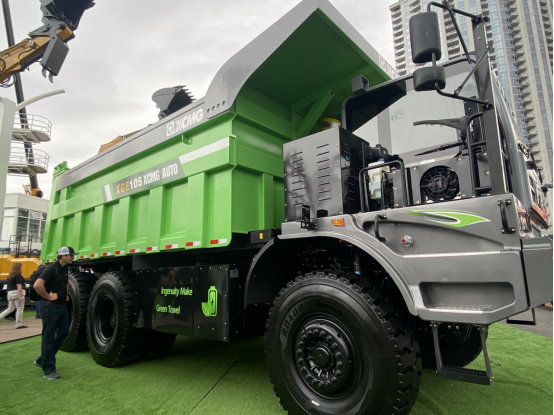 徐工自主研发的纯电动重卡XGE105在展会上亮相。该车匹配高效的制动能量回收系统,峰值回馈充电最高可达980A。