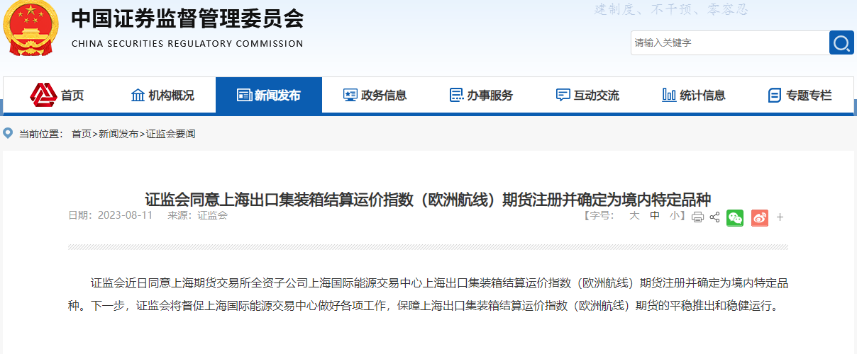 证监会近日同意上海期货交易所全资子公司上海国际能源交易中心上海出口集装箱结算运价指数(欧洲航线)期货注册并确定为境内特定品种。