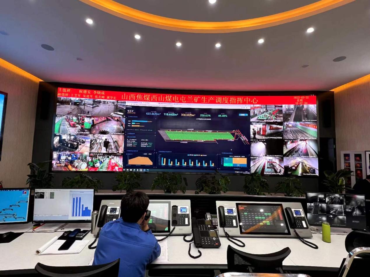 在山西焦煤西山煤电屯兰矿的生产调度中心,工作人员按下采煤按钮,各台智能化设备有序运转,割煤、推溜、移架到运输,全程远程遥控、自动作业,巨大的电子屏实时显示着采煤场景,井下的安全生产状况和设备的运行状态一览无余。