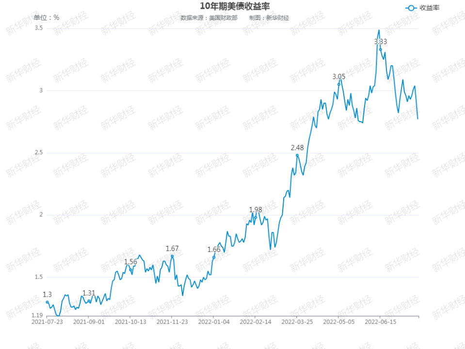 新华财经北京7月23日电(李奇涵)美债收益率周五(当地时间22日)在美联储加息前继续回落,业内人士预测10年期美债收益率将跌至2.5%甚至更低。截至纽约市场收盘,基准10年期美债收益率大幅下跌15.4个基点至2.754%的8周低点,这是自2020年3月以来的最大单日跌幅。与此同时,30年期美债收益率跌至3.0%关口以下。