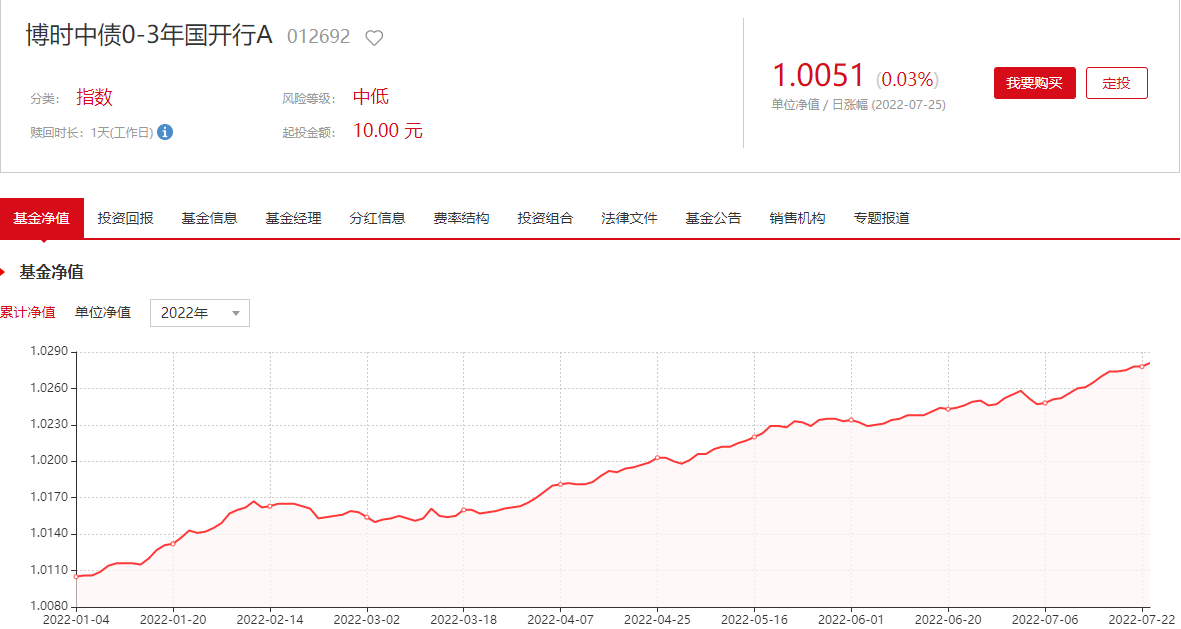 数据显示,去年9月9日成立生效的博时中债0-3年国开行A目前的单位净值为1.0051,最近30日的收益率为0.3%,今年以来的收益率为1.77%,成立以来的收益率2.83%。