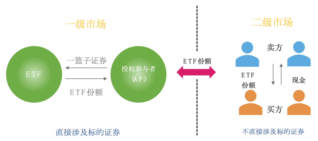 ETF的申购和赎回属于一级市场交易活动。ETF 结构中的申购赎回机制使得ETF 的份额数量能够根据需求增加或减少。每个交易日 ETF 都会按照要求公布适用于下一交易日的申购赎回清单(creation and redemption baskets)。申购赎回清单是载明了一篮子证券、现金和/或其他资产名称及数量的详细表单。通常,申购赎回清单是按照整个投资组合等比例缩小或代表性抽样的方式来进行构建的;但有的时候,申购赎回清单披露的可能仅仅是 ETF 实际投资组合的一个子集和一定数量的现金。例如,构成债券 ETF 申购赎回清单的现金和债券比例可能每天都会不一样,这是因为纳入清单的债券和现金是由标的债券市场的流动性来决定的。通常情况下,ETF每天的申购赎回清单相差并不大。