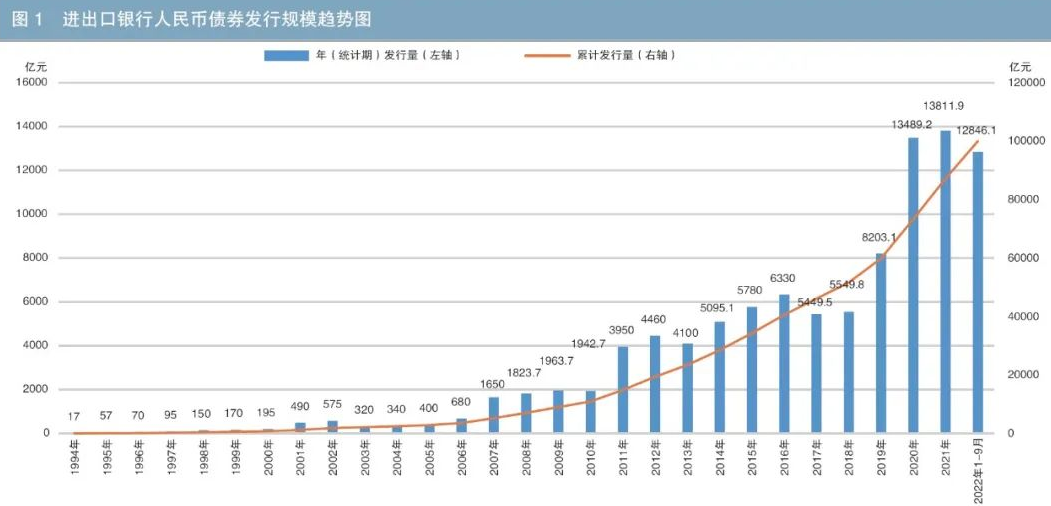 第五阶段:2021年至今。2021年是“十四五”开局之年,进出口银行立足新发展阶段,服务新发展格局,全年发行人民币债券约1.38万亿元(见图1),再创历史新高。截至2022年9月末,进出口银行当年的发行量已突破1.2万亿元;自1994年成立以来的人民币债券累计发行量成功突破10万亿元大关,债券存量规模近4.5万亿元。