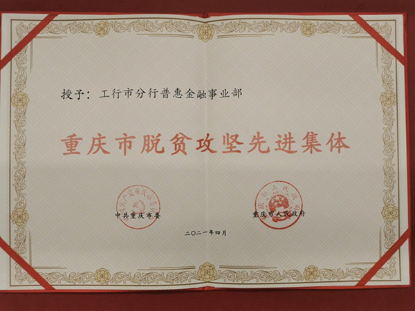 4月15日,重庆市脱贫攻坚总结表彰大会在人民大厦举行。工行重庆市分行普惠金融事业部,作为该行金融扶贫牵头部门,获重庆市脱贫攻坚先进集体称号。