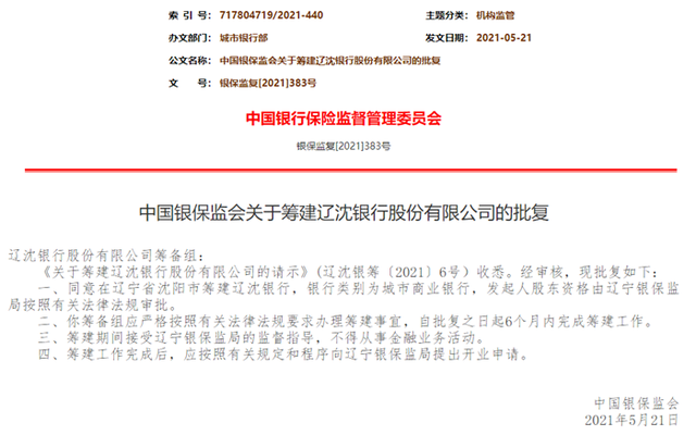 银保监会的批复显示,辽沈银行需自批复之日起6个月内完成筹建工作;筹建期间接受辽宁银保监局的监督指导,不得从事金融业务活动;筹建工作完成后,应按照有关规定和程序向辽宁银保监局提出开业申请。