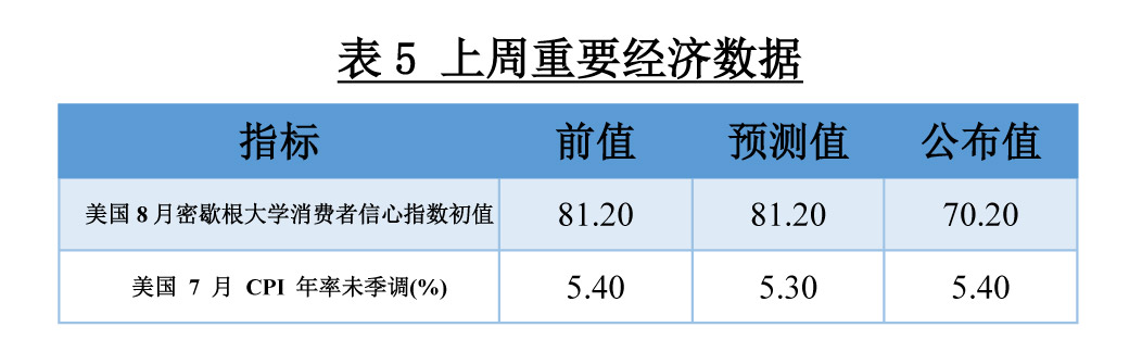 本周,国际金价呈现V型走势。周初,因受上周强劲非农数据影响,国际金价大幅下跌,但由于周三公布的美国7月CPI升势减缓,且周五公布消费者信心指数不佳,市场对美国经济复苏前景感到担忧,国际金价大幅上行,最终报收于1779.22美元/盎司。