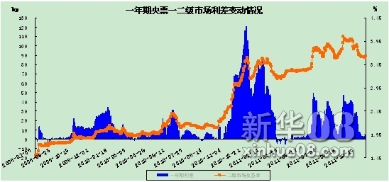 截至10月28日一年期央票一二级市场利差为4.75BP。