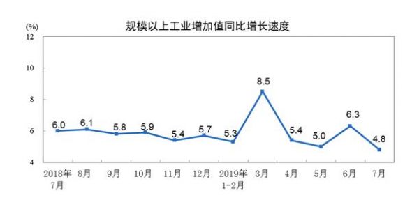 统计局数据显示,2019年1-7月份,全国固定资产投资(不含农户)348892亿元,同比增长5.7%,增速比1-6月份回落0.1个百分点。2019年7月份,规模以上工业增加值同比实际增长4.8%,比6月份回落1.5个百分点。7月社会消费品零售总额增速7.6%,较6月回落2.2个百分点。1-7月份,全国居民消费价格同比上涨2.3%。7月城镇调查失业率为5.3%,较6月的5.1%回升0.2个百分点。
