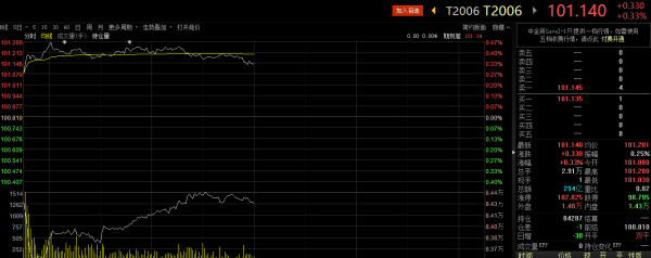 国债期货早盘表现强势,10年期主力T2006小幅跳空高开后继续上涨,将涨幅一度扩大至0.47%,日高为101.28,午盘收涨0.33%报101.14,回升至上周一盘中水平。