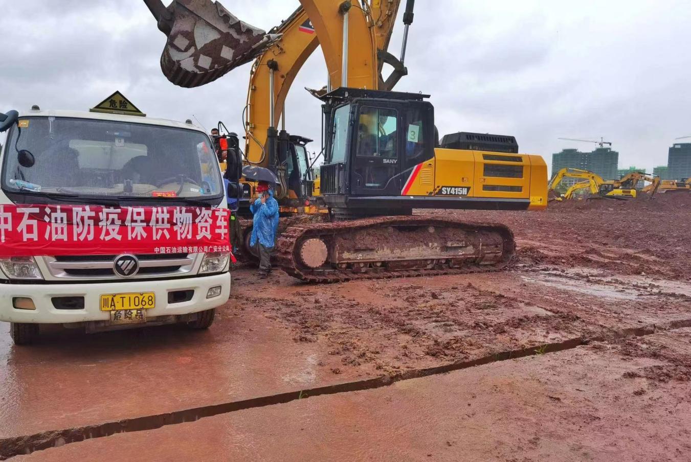 方舱医院扩建工地现场,中国石油小额配送车正在为施工机具加注油品。