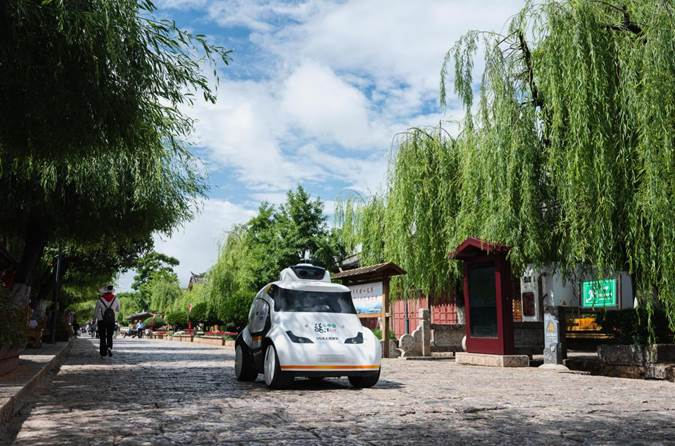 图为丽江古城5G无人巡逻车在进行巡逻作业