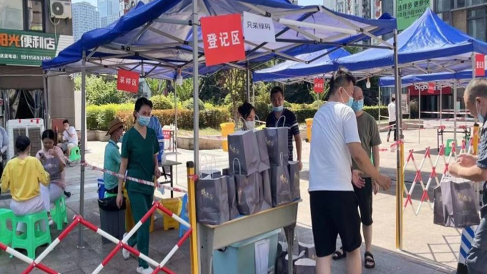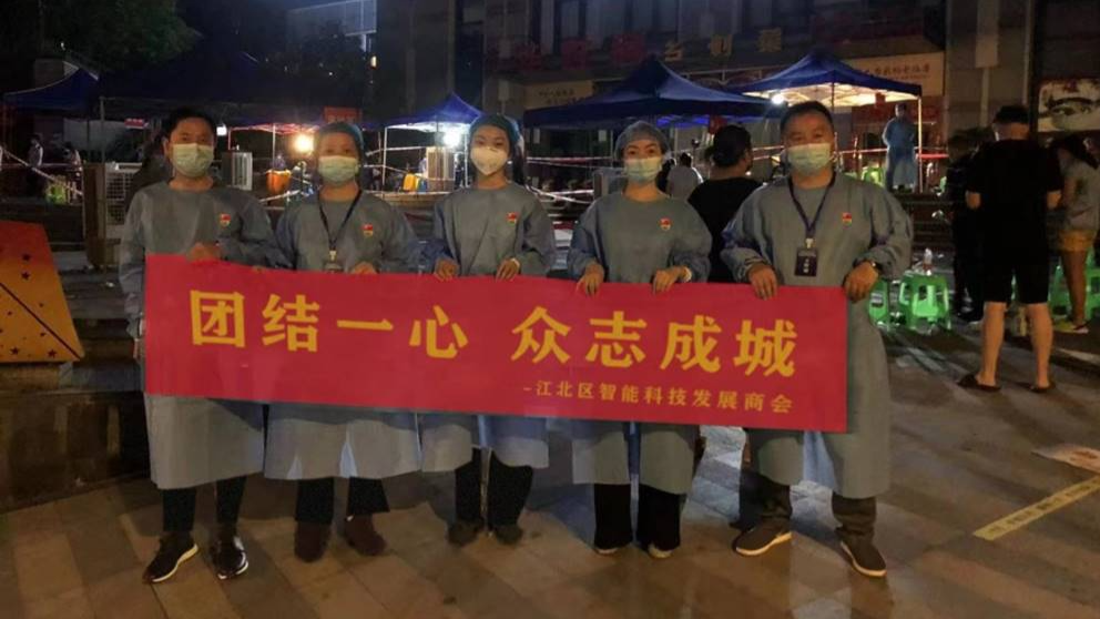 图为江北区智能科技商会以“逆行者”的姿态奋战在核酸检测一线