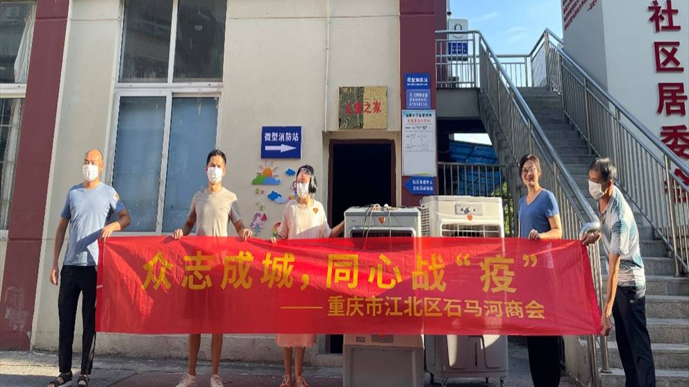 江北区石马河商会充分发挥资源优势,筹措物资,为基层工作人员送上了2台水空调及酸奶、饮品等爱心物资,同时动员会员单位组织30名志愿者投入到各个采样点的服务中。从8月23日下午到24日中午,近20个小时,商会志愿者战高温,战疫情,共同确保核酸检测工作顺利进行。