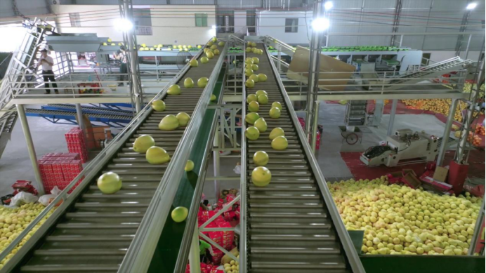 图为梅县金柚产业园内,工人们借助机器分拣柚子