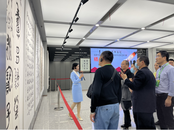 10月30日,在江西省奉新文体艺术中心内,讲解员为游客介绍名家字画。