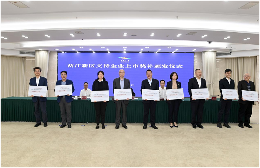 活动现场,两江新区向新安洁、山外山、西山科技、马上消费、海扶医疗、欧菲斯、宇隆光电、华龙网等九家企业颁发了上市奖补资金。