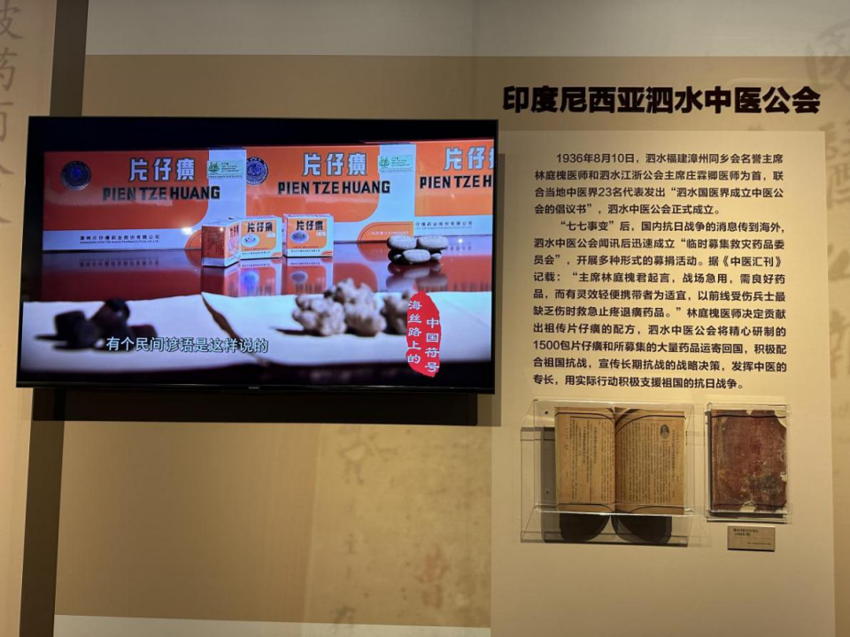 展览期间,一部央视《国宝档案》专题片、一本尘封多年的《中医汇刊》、一张张东南亚药店照片、一件件鲜活的事例……记录了抗日战争时期印尼泗水华侨林庭槐募捐片仔癀等药品支援抗战一线的珍贵历史,讲述了片仔癀在东南亚当地治病救人的故事。