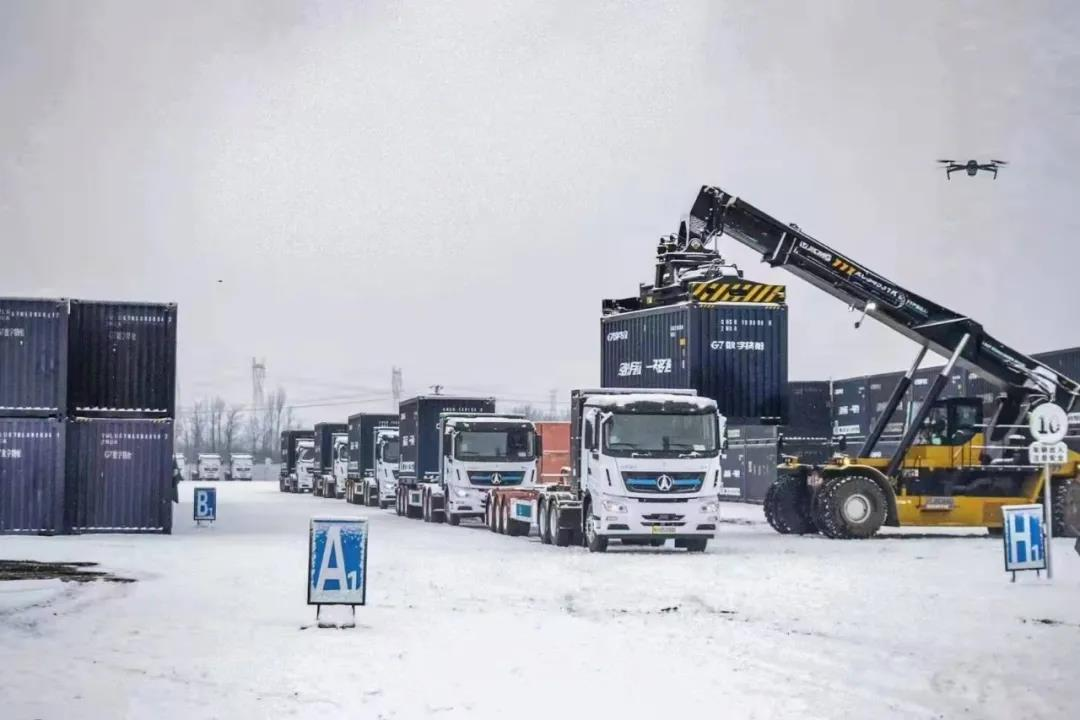 穿过整齐摆放的集装箱,庞大的吊车对准、吊起、放稳,一件件满载煤炭的集装箱就乘上换电重卡,从包头西部陆港运往电厂。