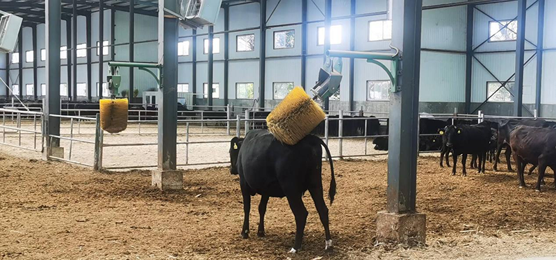 这是在长春市皓月集团的沃金黑牛示范舍内,正在自己使用按摩器的牛。新华社记者张博宇摄
