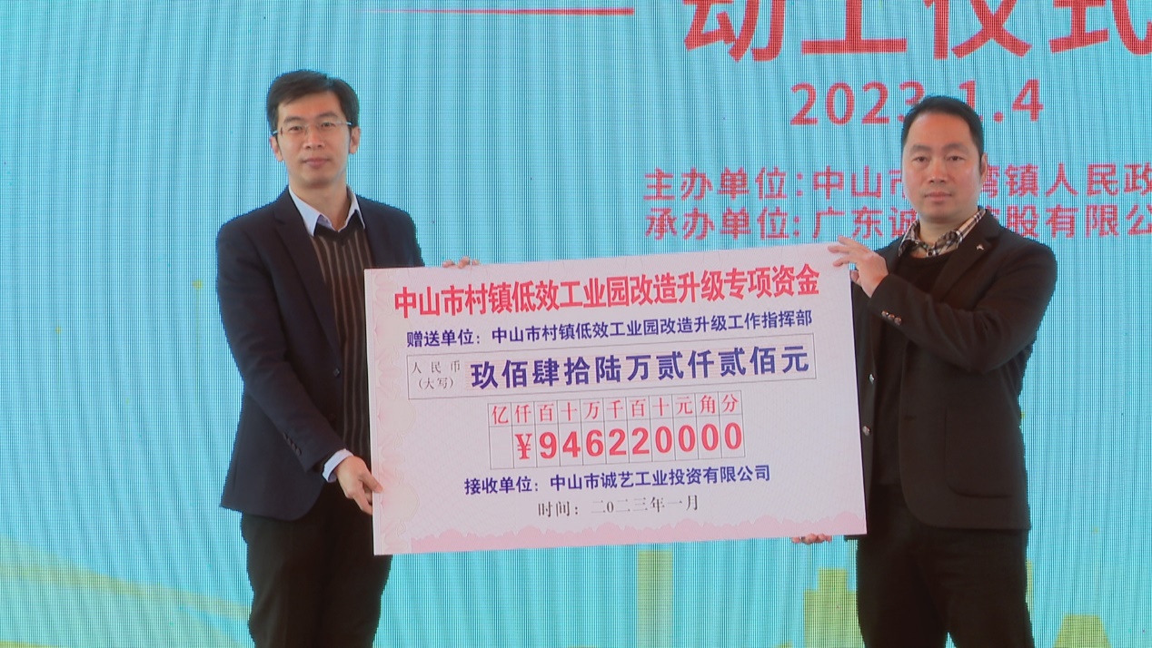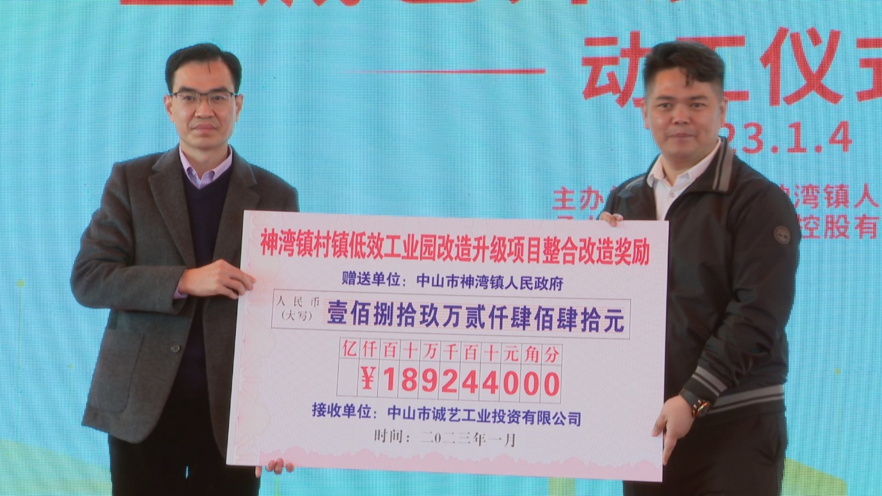 诚艺·外沙科创城作为全市首个获得市低效工业园改造升级项目整合改造奖励的项目,为提升其作为我镇“工改”标志性项目的辐射影响力,中山市人民政府与神湾镇人民政府现场分别为外沙科创城发放改造整合奖励资金支票约946万元和189万元,合计奖励超千万。