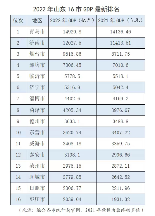 2022年,山东省实现地区生产总值(GDP)87435亿元,稳居全国第三位。截至2023年2月10日,综合各市公布的信息,16市生产总值都已超过2000亿元。其中菏泽市首次突破4000亿元大关,连续4年稳居第8位。