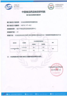 近日,山东省临沂市检验检测中心收到国家药监局综合司关于2022年检验能力验证计划满意结果的通报。食药中心参加的化妆品中铜绿假单胞菌检验能力验证结果为:满意。这是中心首次参加即通过的国家局组织的该项目的能力验证。