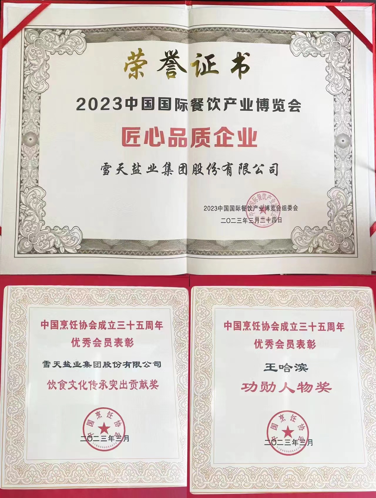 3 月 26 日,恰逢上市五周年,雪天盐业再添新喜,在中国烹饪协会主办的 2023 中国国际餐饮产业博览会上,荣获“匠心品质企业奖”“饮食文化传承突出贡献奖”,雪天盐业总经理王哈滨荣获“功勋人物奖”。湖南省轻工盐业集团党委委员、副总经理李振汉带队出席颁奖大会。