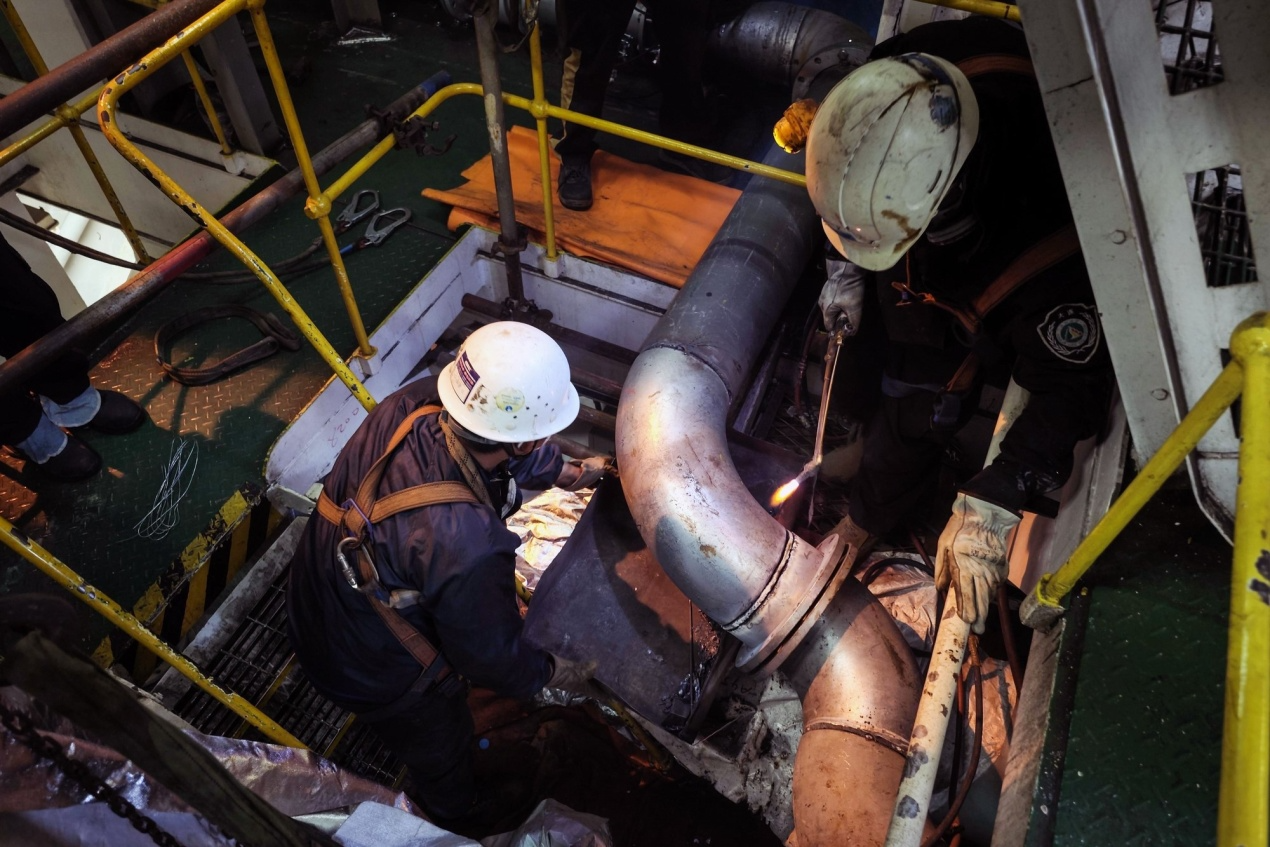 (浙能迈领公司及施工单位一线员工为地中海航运公司OLIA号船舶安装脱硫塔供水管道)