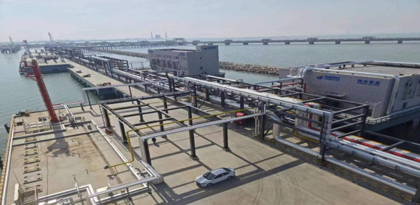东营港北防波堤#5-#6油品化工泊位一期工程,是山东省沿海港口整合以来批准新建的重点港口项目之一。该项目由山东金港港务有限公司投资建设,项目总投资10亿元,设计年通过能力850万吨,2020年7月开工。建设规模为新建2座10万吨级油品化工泊位及相应配套设施,其中#5泊位为液化烃专用泊位,主要装卸低温乙烯、低温乙烷、低温丙烷、LPG、丙烯等;#6泊位为液体化工品及油品泊位,主要装卸原油、燃料油、汽柴油、甲醇、MTBE、二甲苯等。