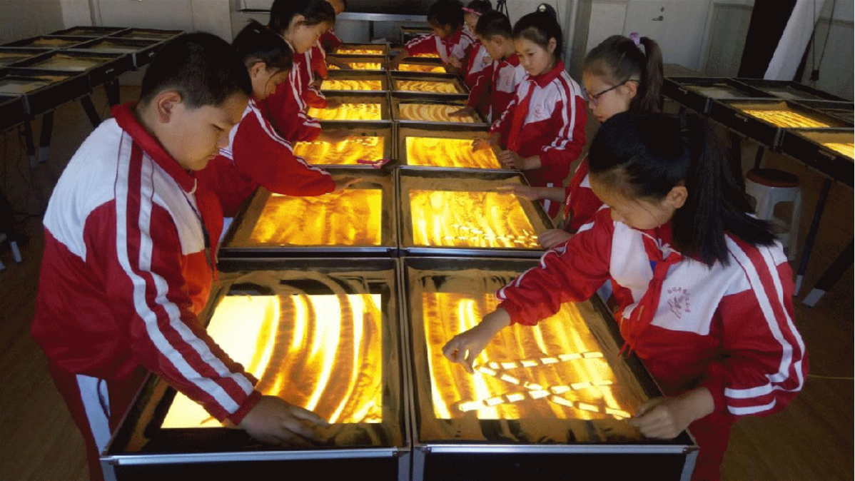 2015年,王爱召镇中心小学引入沙画课程,拉开了达拉特心育沙画教学研究实践的帷幕。历经8年的发展,达拉特旗沙画教育扩展到32所中小学幼儿园,目前全旗有动态沙画台500余台。
