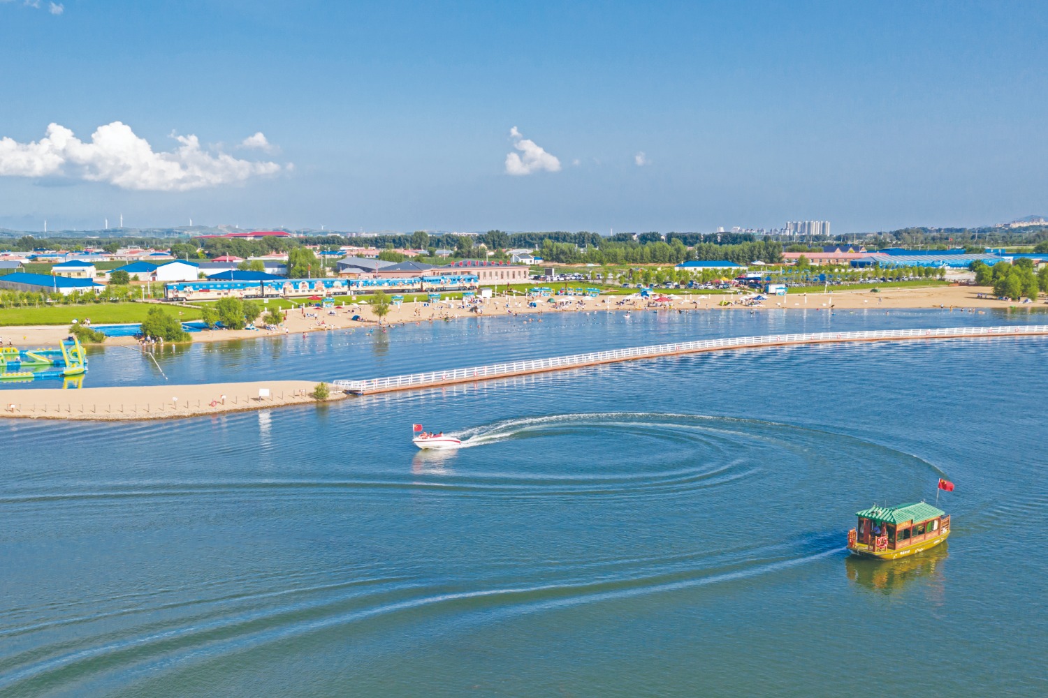 微风吹拂,水明如镜,金色沙滩绵软洁净。在乌兰浩特市,有一片藏在城市中的“海滩”——神骏湾生态体验区。空中俯瞰,仿佛一颗耀眼明珠,光彩夺目;漫步其中,清爽“海风”迎面而来,让人神清气爽。