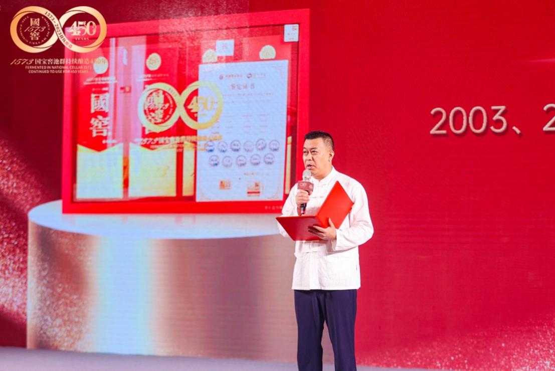 泸州老窖股份有限公司副总经理、首席质量官何诚在活动中致辞。,他提到“,今年,恰逢泸州老窖1573国宝窖池群持续酿造的第450个年头。450年波澜壮阔,450年薪火相传,为华夏酒业带来了一段荣耀传奇,也给消费者留下了诸多老酒珍品。作为中国瓶储年份酒的开拓者,泸州老窖在中国酒业协会的指导支持下,坚持高品质、高标准和高价值的运作理念,致力于打造老酒的“四大标杆”,即:文化标杆、消费标杆、投资标杆和行业标杆。”