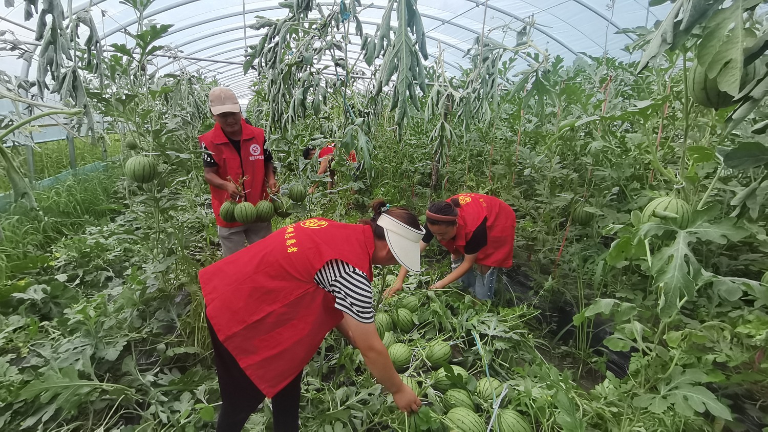 走进圣童西瓜种植大棚里,映入眼帘的尽是绿意,翠绿的西瓜藤蔓爬满一地,一个个油亮圆润的西瓜在瓜藤丛中若隐若现。宝力根花苏木宝力根花嘎查种植户陈秋胜带领村民正顶着烈日采摘刚刚成熟的西瓜,村民们分工明确、其乐融融。