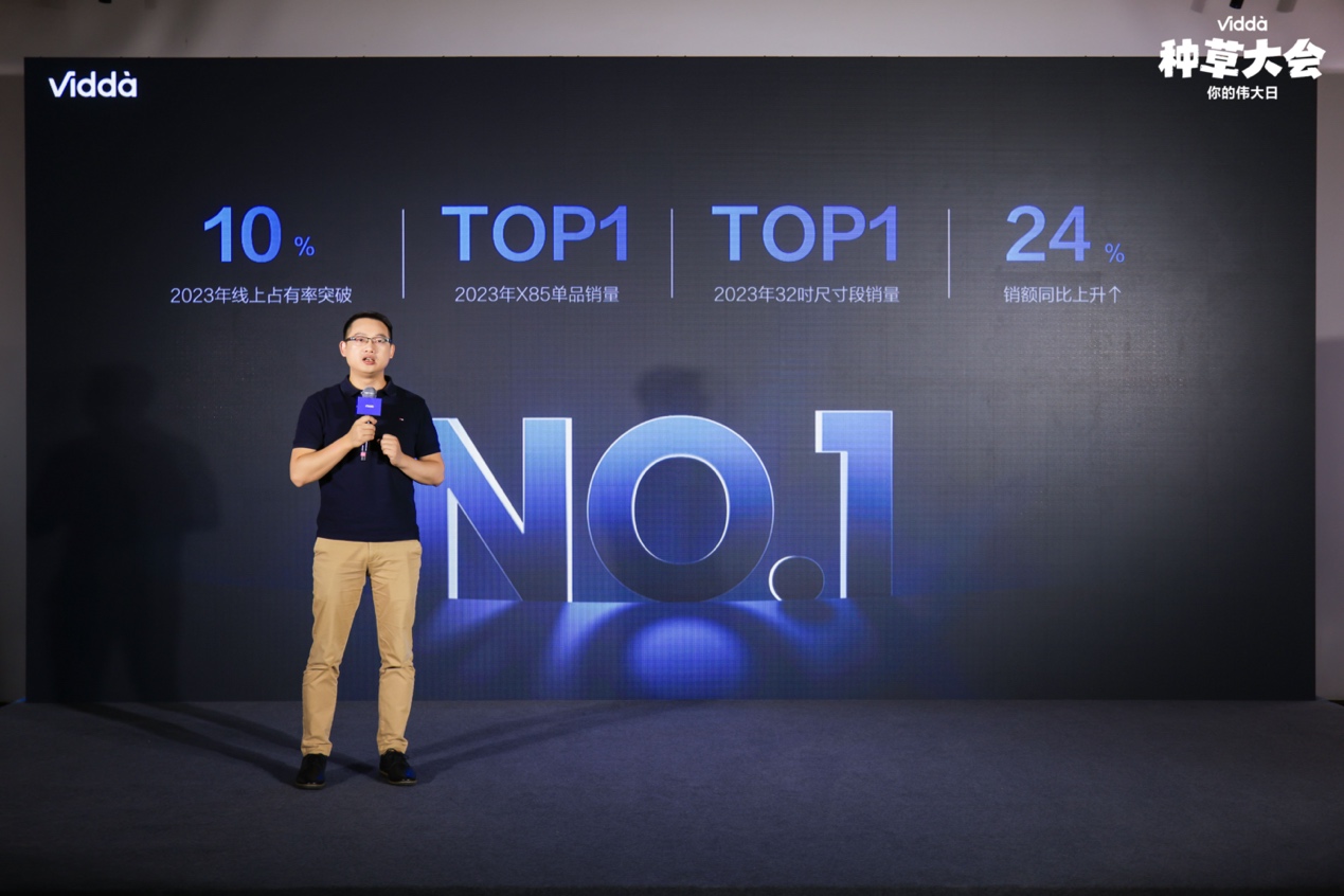 8月25日,海信集团旗下年轻科技潮牌Vidda在青岛举办了“你的伟大日——Vidda 8.26种草大会”。在发布会环节,Vidda公布了品牌升级三年以来的战绩:电视市场占有率突破10%,成为线上渠道增长最快的年轻品牌,其中X85成为2023行业单品销量冠军。