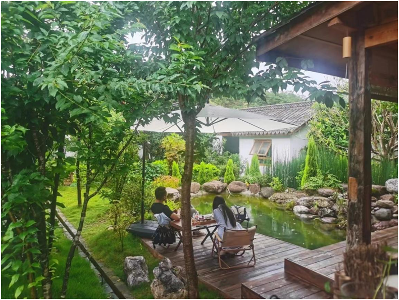 图片:游客在位于老爪箐村的“尘园”内品咖放松。(思茅区融媒体中心2023年11月供稿)