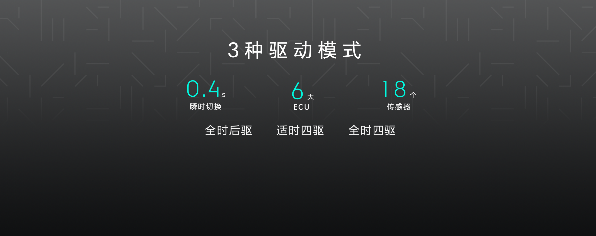 气候、路况不佳,全时四驱让人更安心。在雨、雪等恶劣天气下,轮胎抓地力会大幅降低。运动/雪地/沙地/越野/个性化驾驶模式匹配的全时四驱,能让行驶更稳健,高效解决转向不足、甩尾或滑移的安全隐患。