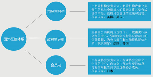 从西方国家的个人征信发展来看,个人征信对信息的采集主要有三种模式:以欧洲大陆为代表的政府主导型,以美国、英国为代表的市场主导型和以日本为代表的会员制模式。