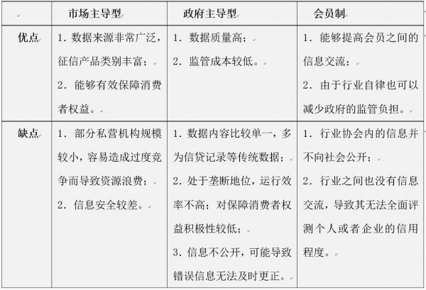 显然,各种不同的征信模式,其优缺点也相对较为明显。(详见表1)