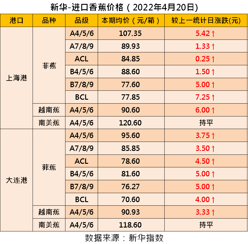 新华指数分析师指出,本监测期(4月14日-4月20日,下同)海南产区香蕉上市量环比增加,云南产区受降雨影响出货减少,国内产区香蕉供应整体不足,好货紧俏,行情持续上涨;销地批发市场方面,受产地蕉价上涨及市场香蕉库存少、流通快影响,全国行情高位微涨;进口蕉方面,菲律宾香蕉减产,越南蕉进入收尾阶段,南美蕉进口量占比小,叠加国内香蕉供应整体不足等多重因素推动进口蕉行情延续上涨;皇帝蕉方面,海南产区供应有限,客商询货积极,产区蕉价处于较高水平。