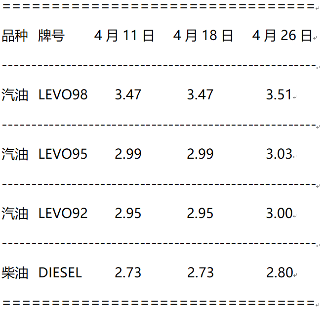 注: 新加坡汽柴油零售市场竞争较为激烈,一般加油站价格不会随意频繁变动,但为了吸引客户,一般加油站都会推出各种不断变换花样的优惠措施。以上数据采自新加坡石油公司(SPC)官方网站,为折扣前原价。最近一次价格调整日期为2022年4月25日。
