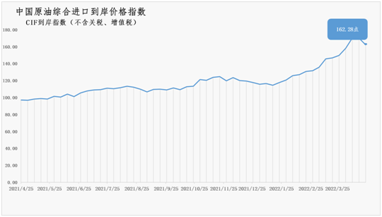 4月18日-24日中国原油综合进口到岸价格指数为162.28 环比下跌4.53%