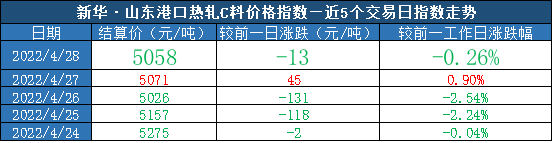 新华财经·指数|山东港口大商中心钢坯、热轧C料价格指数日报(4月28日)