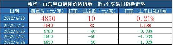 新华财经北京4月28日电(吕世阔) 截至2022年4月28日,新华·山东港口钢坯价格指数报4850元/吨,较前一交易日上涨10元/吨,涨幅0.21%。
