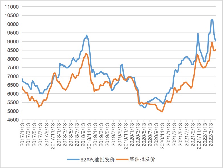 图表:中国汽柴油批发价格指数周度均价走势图(单位:元/吨)