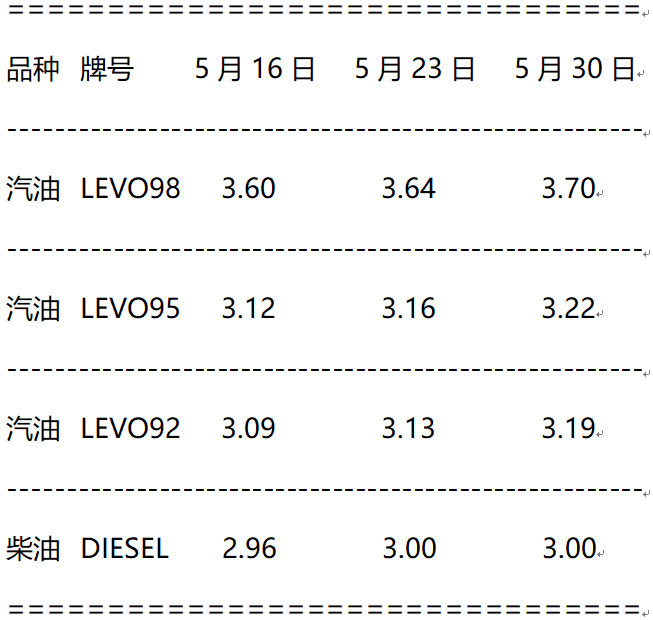 注: 新加坡汽柴油零售市场竞争较为激烈,一般加油站价格不会随意频繁变动,但为了吸引客户,一般加油站都会推出各种不断变换花样的优惠措施。以上数据采自新加坡石油公司(SPC)官方网站,为折扣前原价。最近一次价格调整日期为2022年5月24日。