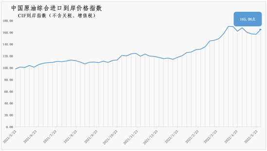 海关总署全球贸易监测分析中心和上海石油天然气交易中心联合发布的中国原油综合进口到岸价格指数显示,2022年5月23日-5月29日,中国原油综合进口到岸价格指数为165.08,环比上涨5.09%,同比上涨62.66%。
