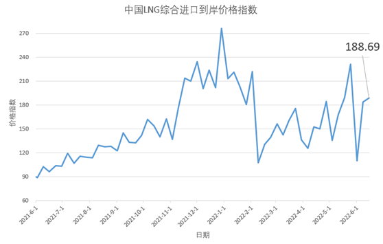 6月6日-12日中国LNG综合进口到岸价格指数为188.69 同比上涨96.33%