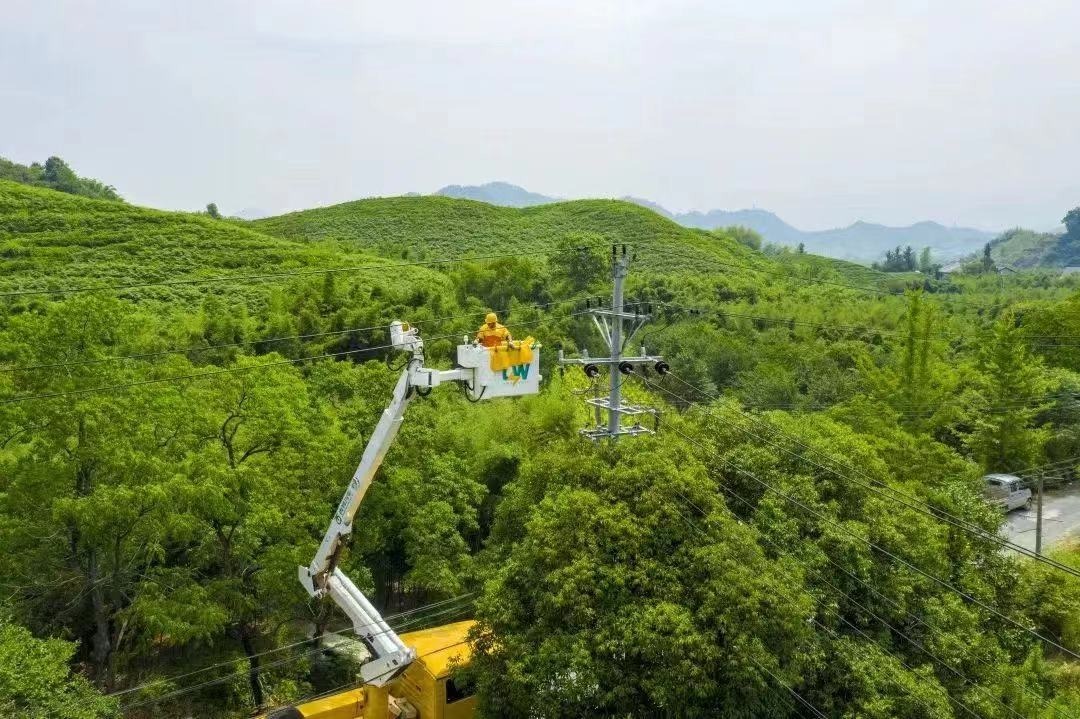 图为国网铜川市供电公司带电作业班工作人员冒着近40度高温,为耀州区庙湾镇玉门村香菇种植基地开辟绿色通道,进行杆塔组立、分界点设备安装及带电接入。